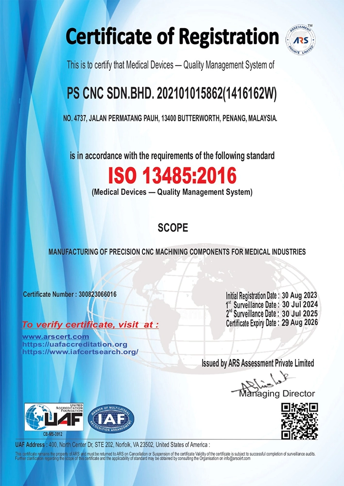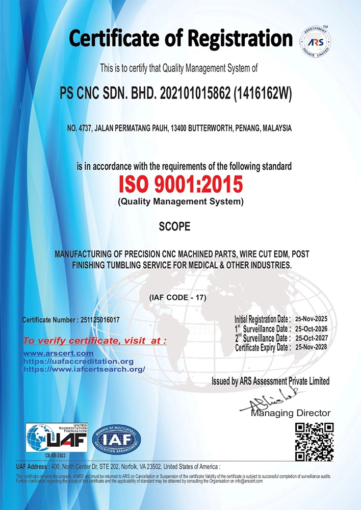 PS CNC Sdn Bhd meets international quality and safety standards, ensuring precision and consistency across all CNC services. Certifications include:
