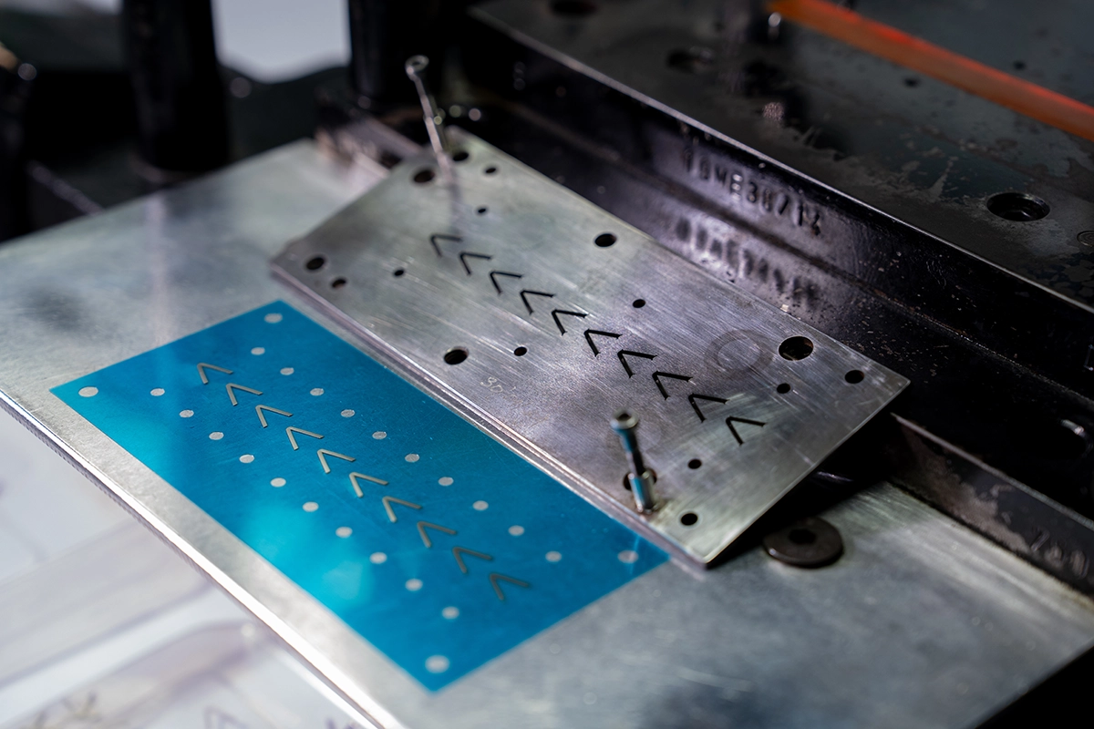 Assembly of thin metal component onto adhesive film using stamping processes, ensuring accurate placement and seamless compatibility with automated handling system